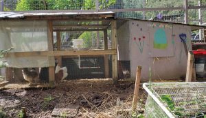 Designed by students using reused materials, this cool chicken coop houses chickens that recycle food and yard waste into rich compost for the school garden!