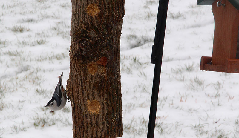 Hang your suet log feeder from a tree branch or a shepherd’s hook. It may take a few hours for the woodpeckers and nuthatches to find it, but when they do, you’ll enjoy watching them dangle upside down and cling to the log to peck out the suet. The suet will need to be replaced as it’s emptied.
