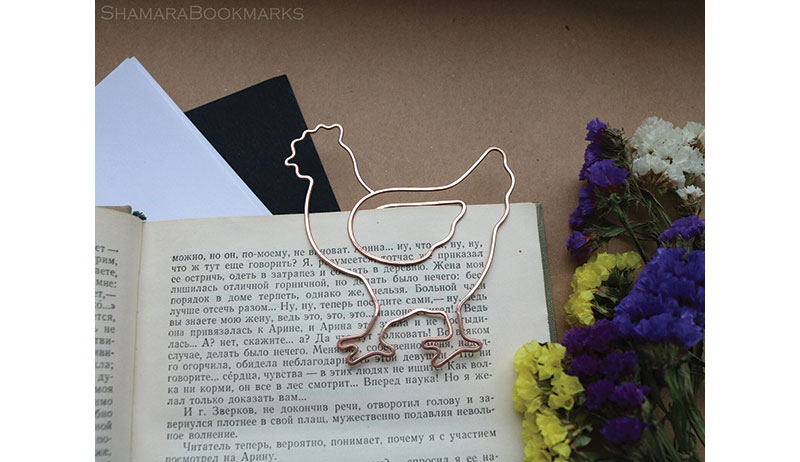 Let this chicken bookmark keep your place without damaging the pages of your book or fearing falling out. Handmade of copper wire, a saying of your choice can be hand-stamped on the wire. $9