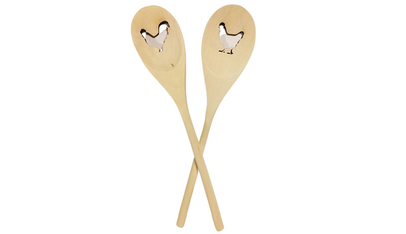 Add some cheer to your meal prep with these wooden spoons featuring a laser-cut hen or rooster, made from solid rubber wood and treated with food-safe beeswax. $4.99